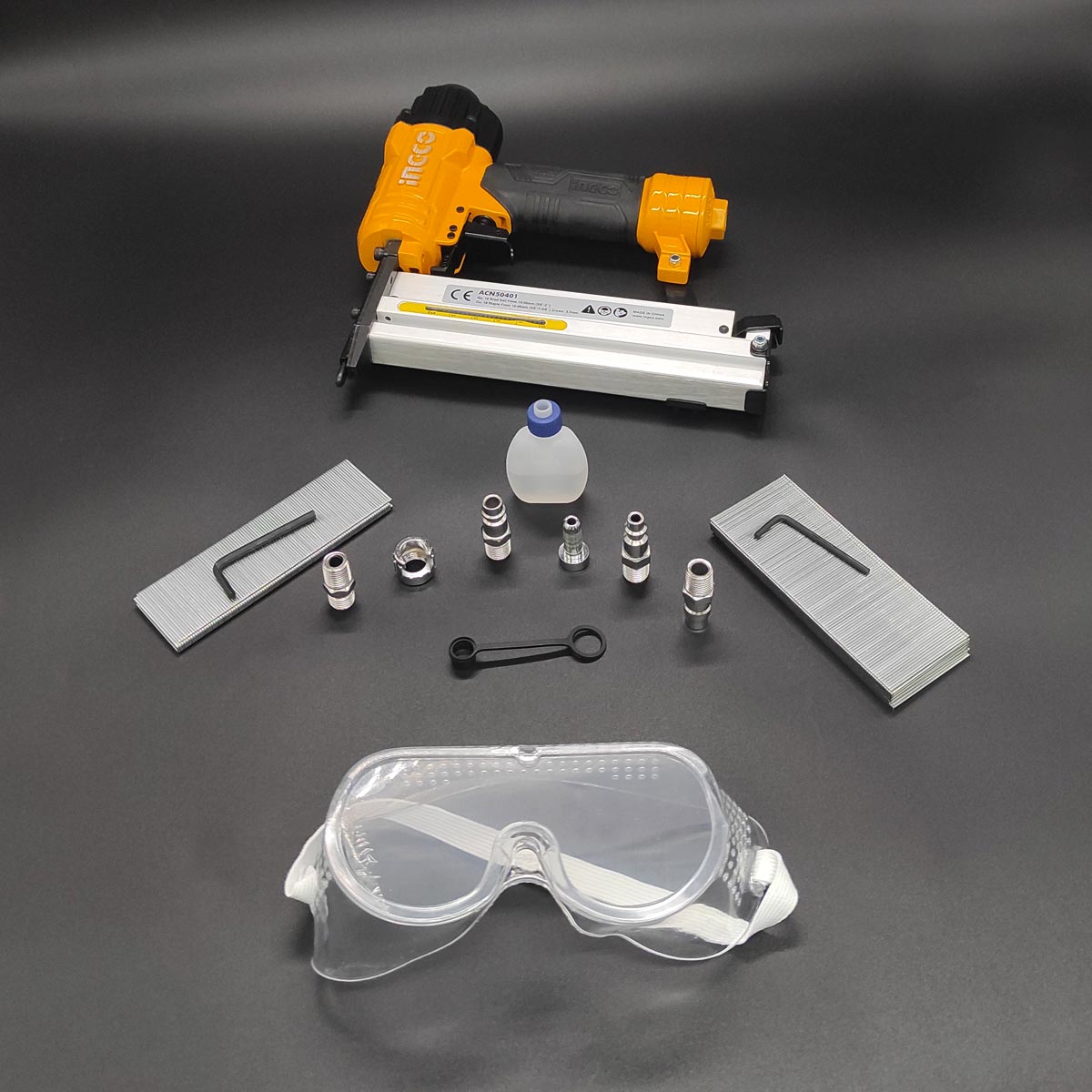 📦 Περιεχόμενα Συσκευασίας: Αεροκαρφωτικό, 200 τεμ. Διχάλα σειρά 90, 1000 τεμ. Καρφιά σειρά 12, 1 τεμ. Γυαλιά προστασίας.