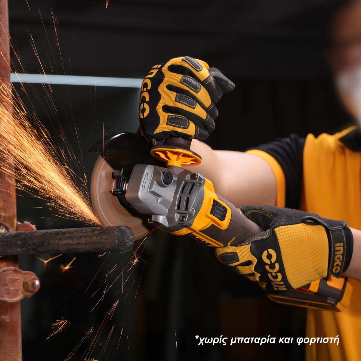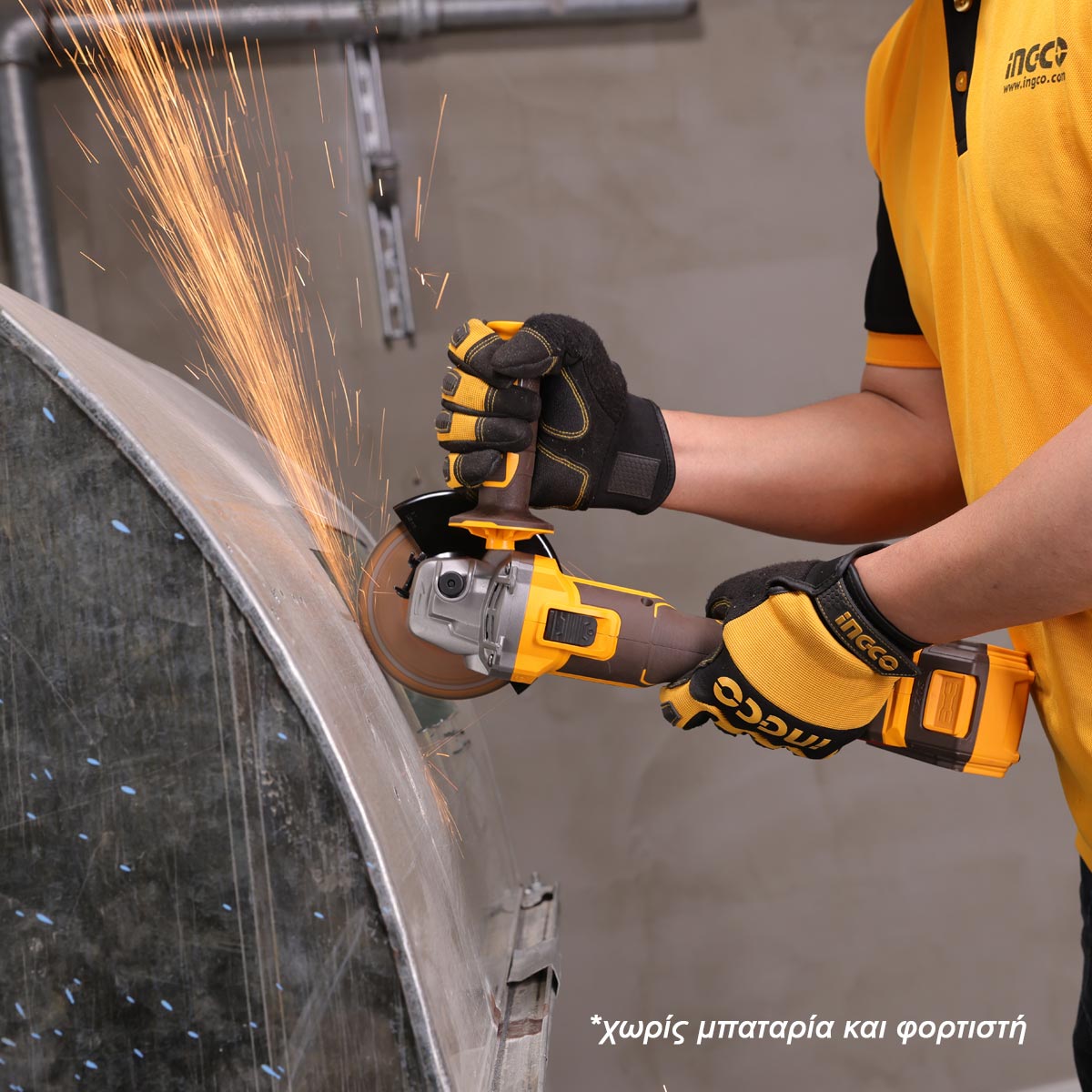 Τάση 20V Li-Ion, έκδοση SOLO (χωρίς μπαταρία & φορτιστή), ισχύς 1000W, διάμετρος δίσκου Φ115mm, ταχύτητα χωρίς φορτίο 3000 / 6000 / 9000 rpm, υποδοχή άξονα M14, brushless motor (χωρίς καρβουνάκια), υποδοχές εξαερισμού για καλύτερη ψύξη.