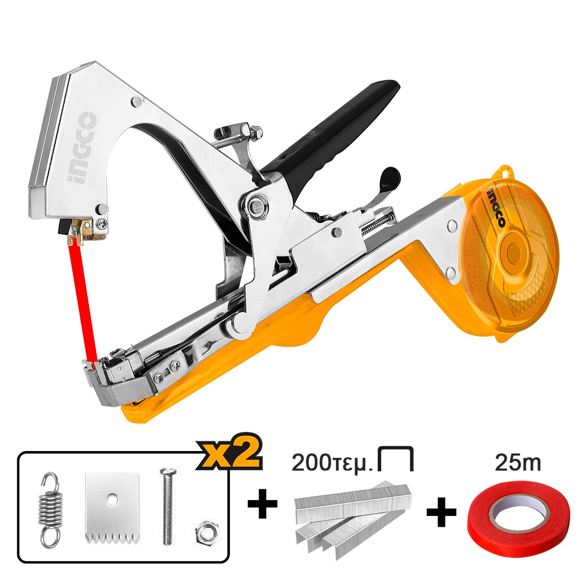 Τύπος δετικό–συρραπτικό φυτών, μεταλλική κατασκευή, διαστάσεις 31×23cm, ρυθμιζόμενο άνοιγμα 0–50mm, δέχεται ταινία έως 30m, άνετη εργονομική λαβή, λειτουργία με το ένα χέρι, κατάλληλο για αμπέλια, ακτινίδια, κηπευτικά, αναρριχώμενα φυτά και λουλούδια, δένει φυτά ή καρπούς με καλώδια στήριξης, ιδανικό για χωράφι, κήπο και θερμοκήπιο, έως 4 φορές πιο παραγωγική εργασία σε σχέση με συμβατικές μεθόδους