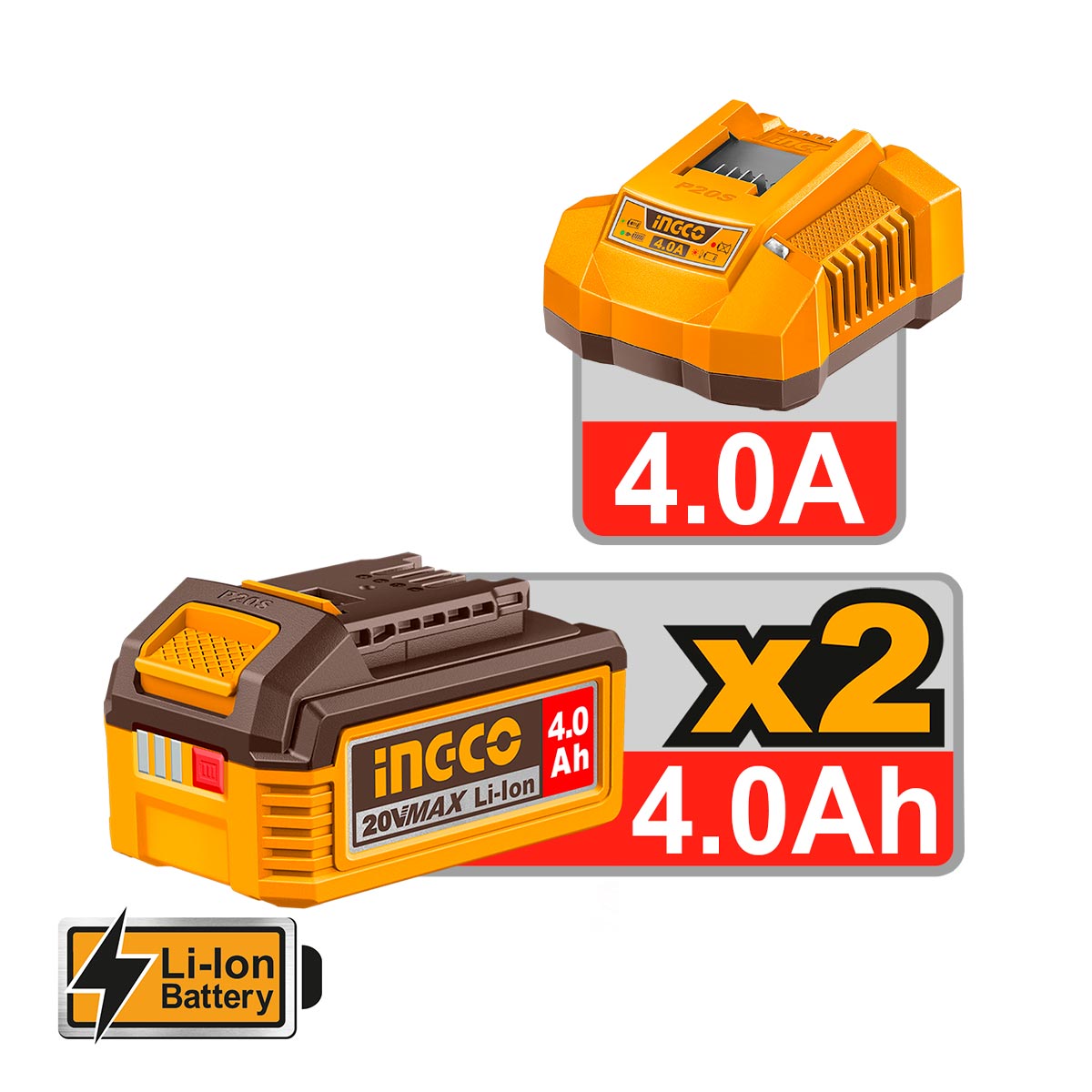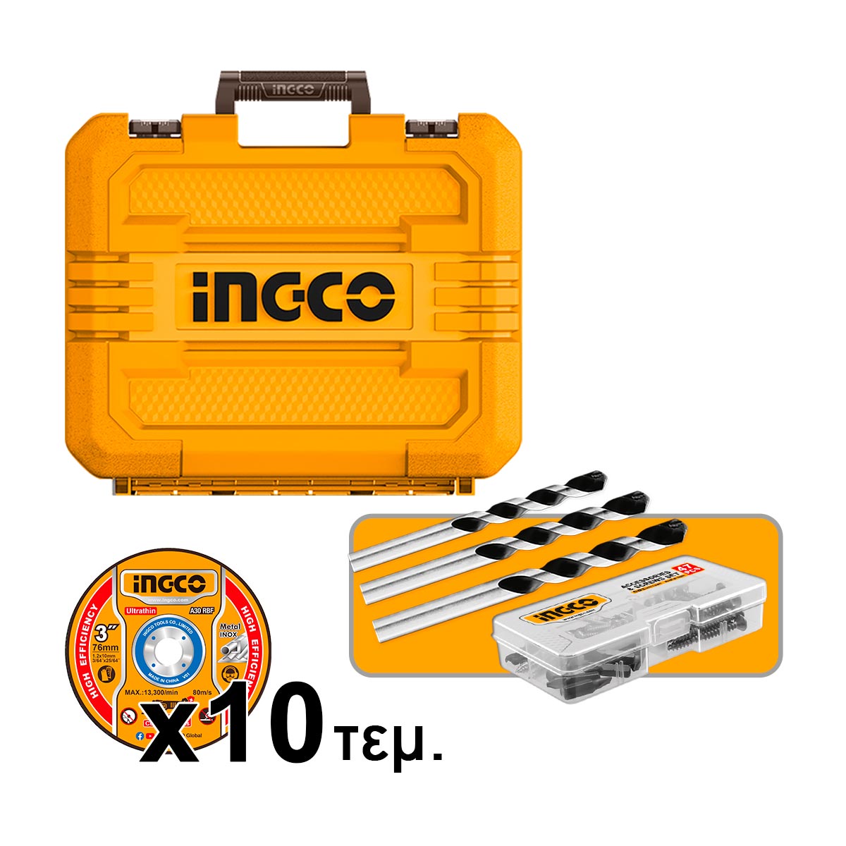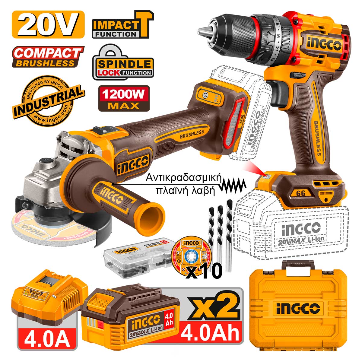 Κρουστικό δραπανοκατσάβιδο μπαταρίας, γωνιακός τροχός μπαταρίας, φορτιστής 4A, 2 μπαταρίες 20V 4.0Ah Li-Ion, 47 εξαρτήματα, 3 τρυπάνια, προφυλακτήρας δίσκου, αντικραδασμική πλαϊνή λαβή, κλειδί, 10 δίσκοι κοπής σιδήρου, πλαστική βαλίτσα.