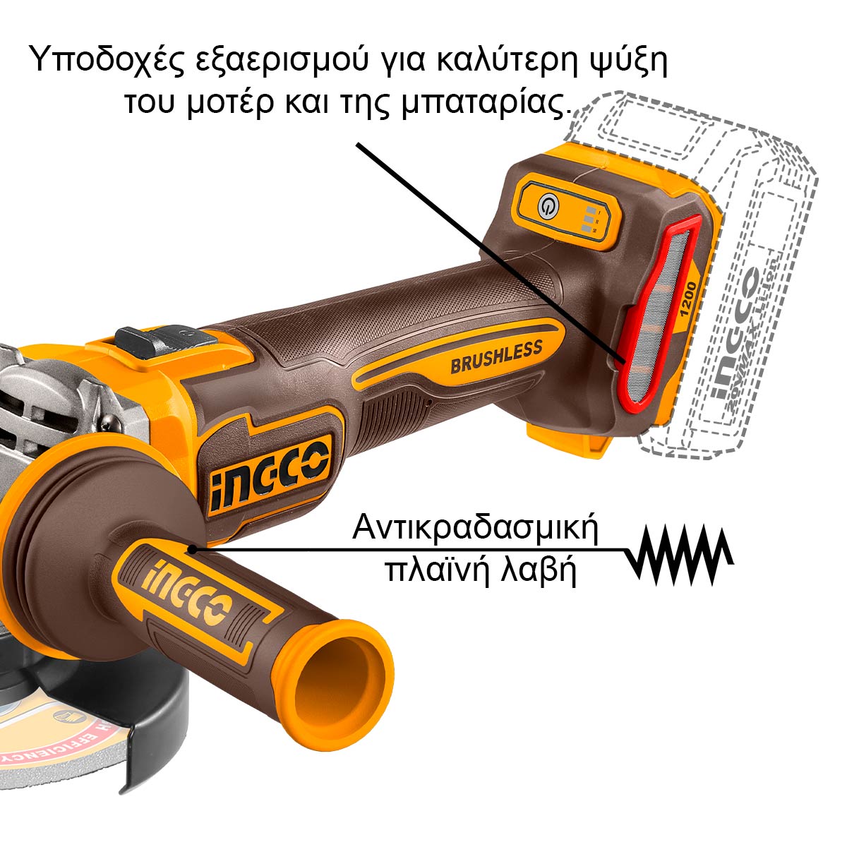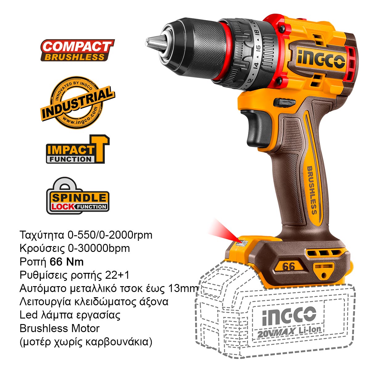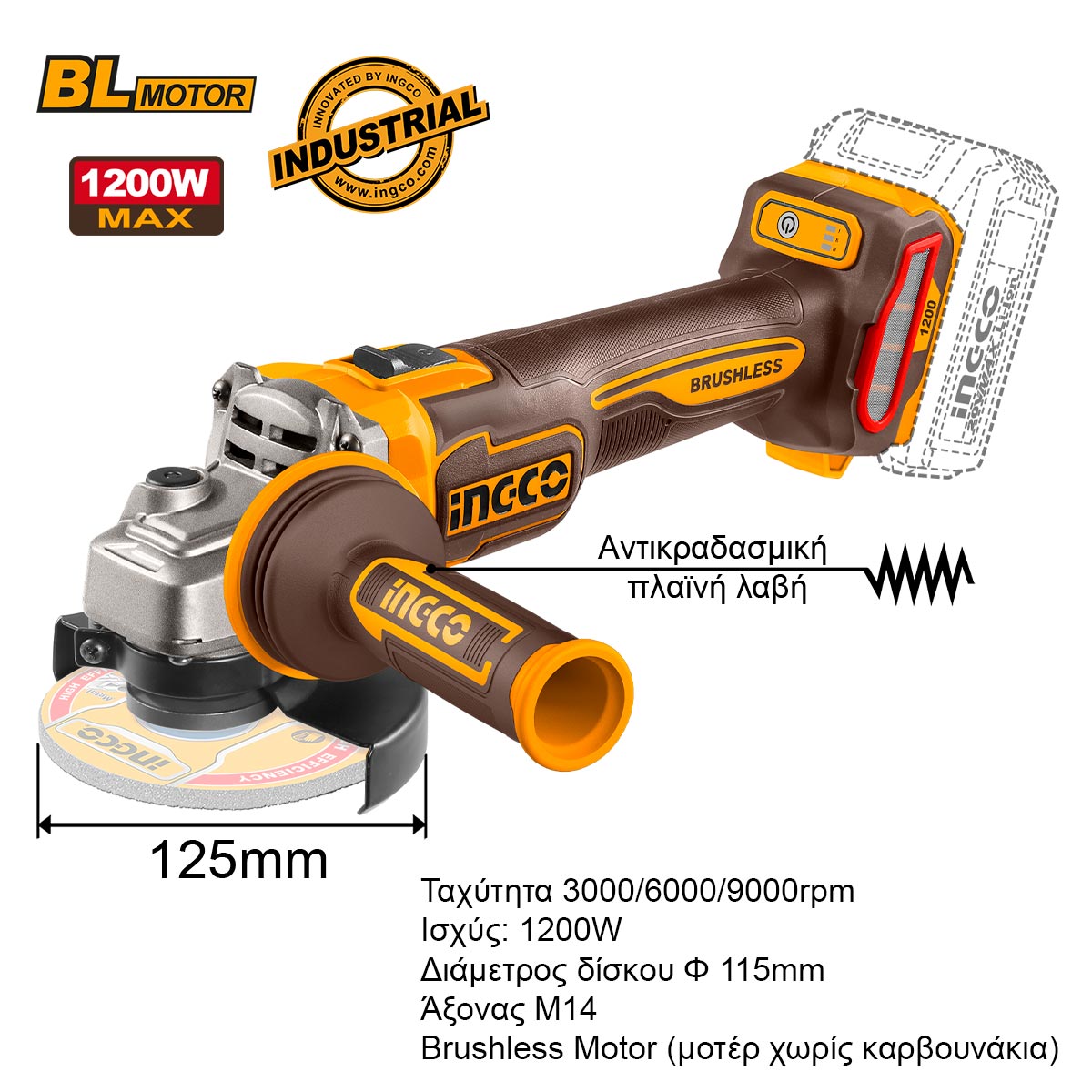 Τάση 20V, LED ένδειξη μπαταρίας, δραπανοκατσάβιδο με ταχύτητα 0-550/0-2000 rpm, κρούσεις 0-30000 bpm, ροπή 66Nm, ρυθμίσεις ροπής 22+1+1, μεταλλικό τσοκ έως 13mm, λειτουργία κλειδώματος άξονα, brushless motor, LED φωτισμός, βάρος 1.14kg, γωνιακός τροχός με ταχύτητες 3000/6000/9000 rpm, ισχύς 1200W, δίσκος Φ115mm, άξονας M14, αντικραδασμική λαβή, brushless motor, βάρος 1.70kg.