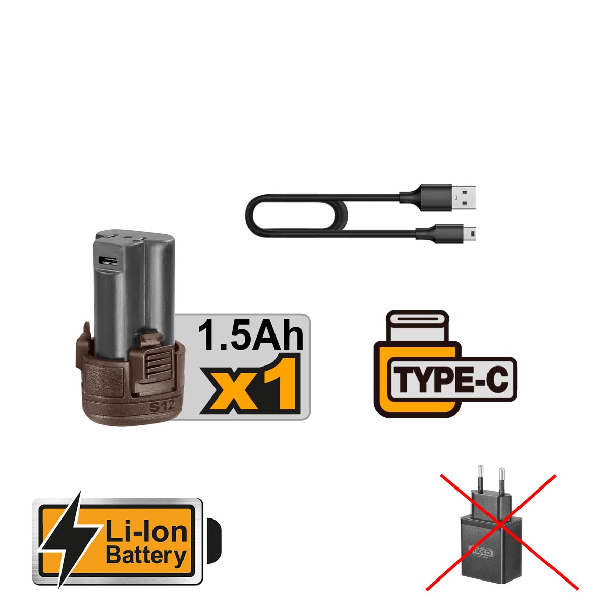 1 × Μπαταρία 12V 1.5Ah Li-Ion USB-C (FBLI12153E), 1 × Καλώδιο USB Type-C,