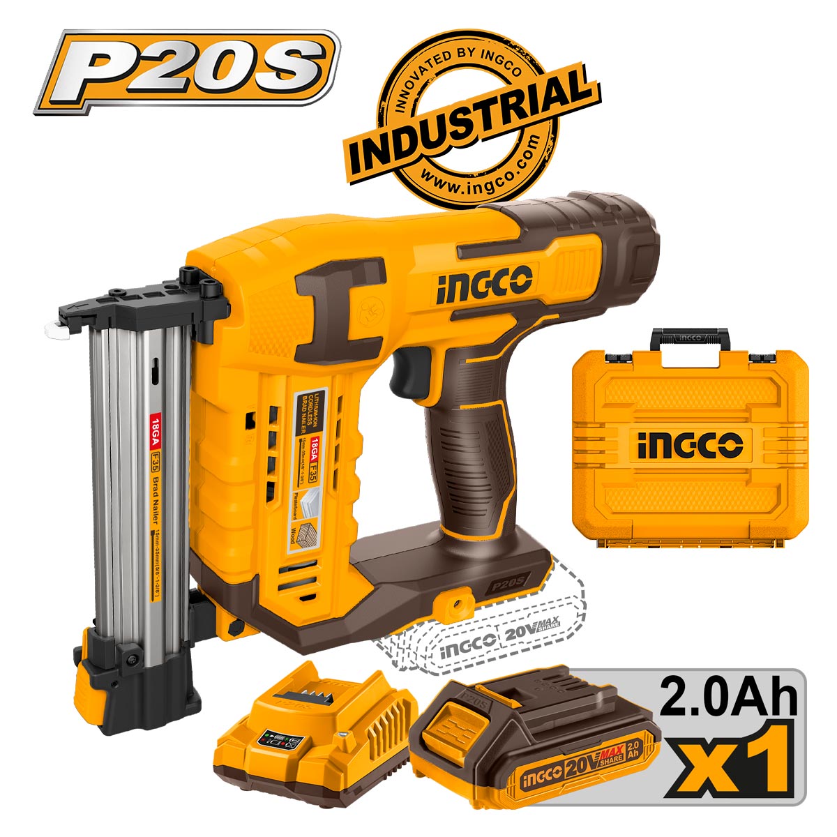 Καρφωτικό μπαταρίας 20V, φορτιστής, μπαταρία 20V 2.0Ah Li-Ion, 1000 καρφιά 35mm (18Ga), πλαστική βαλίτσα μεταφοράς.