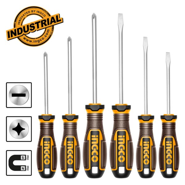 Σετ 6 κατσαβιδιών INGCO με ίσια και σταυρού μύτη, εργονομική λαβή και ανθεκτικό ατσάλι, για καθημερινή και επαγγελματική χρήση.