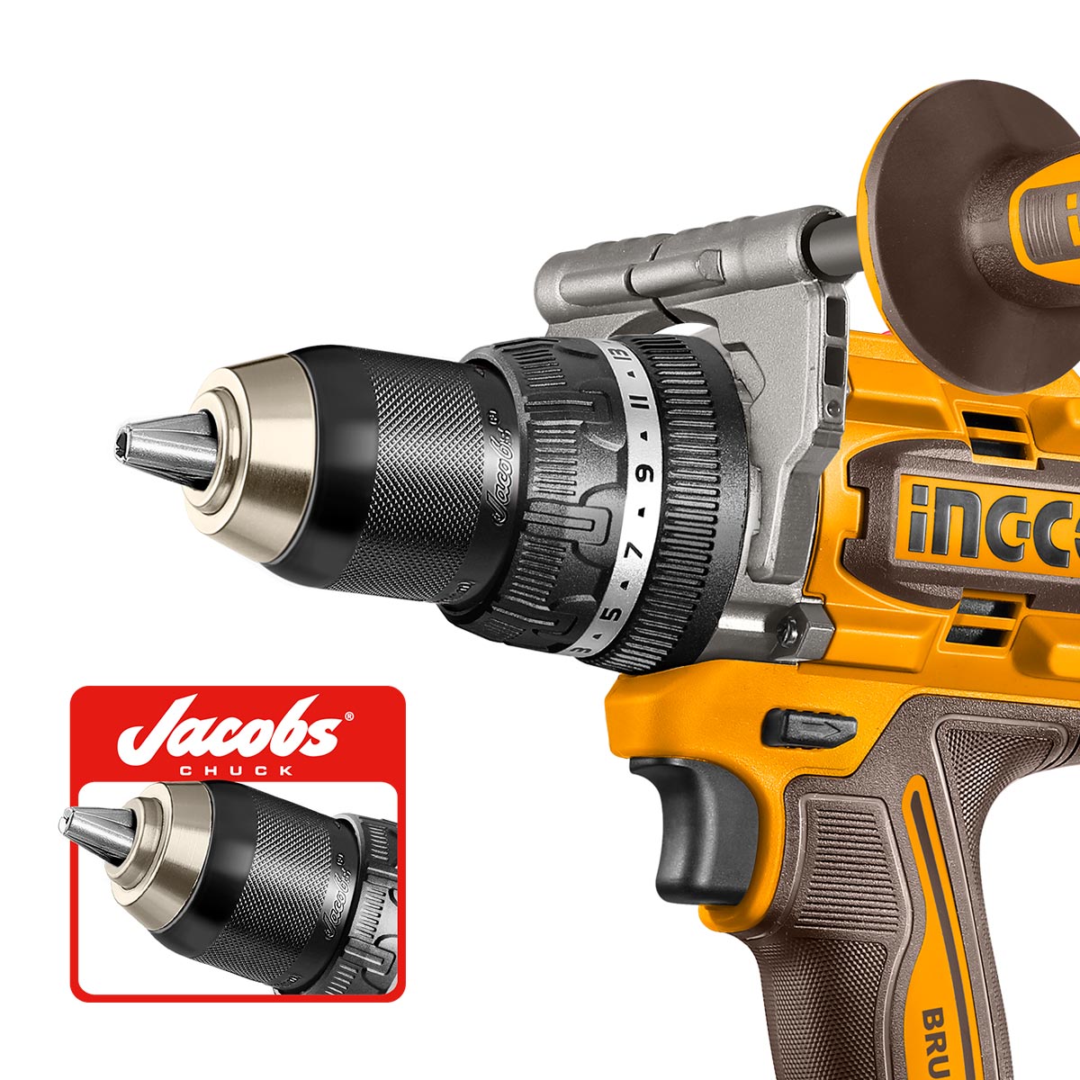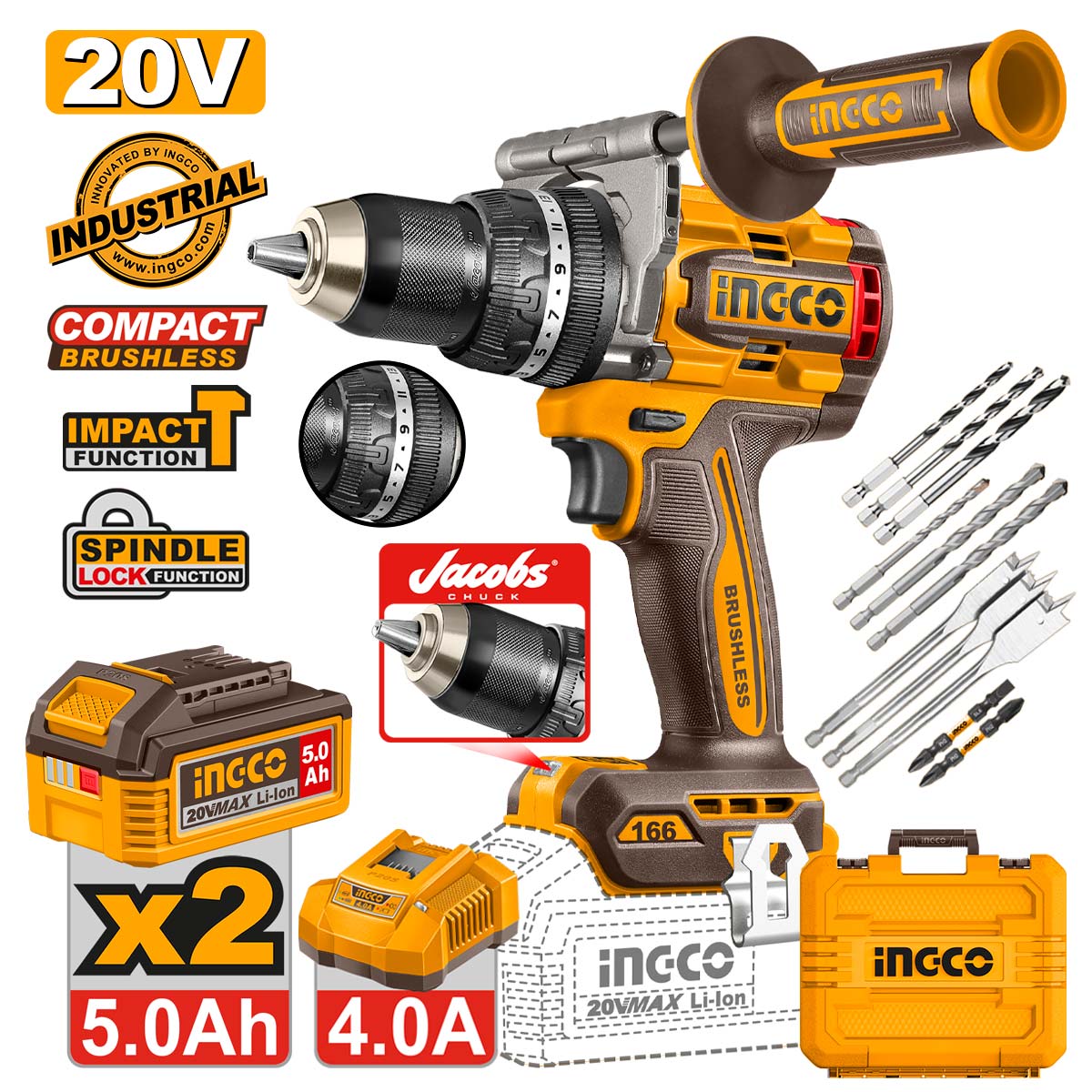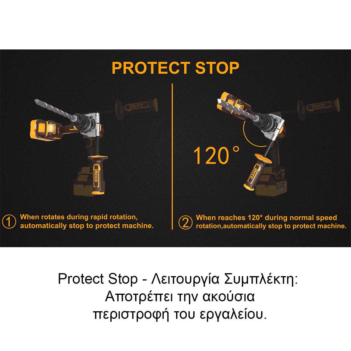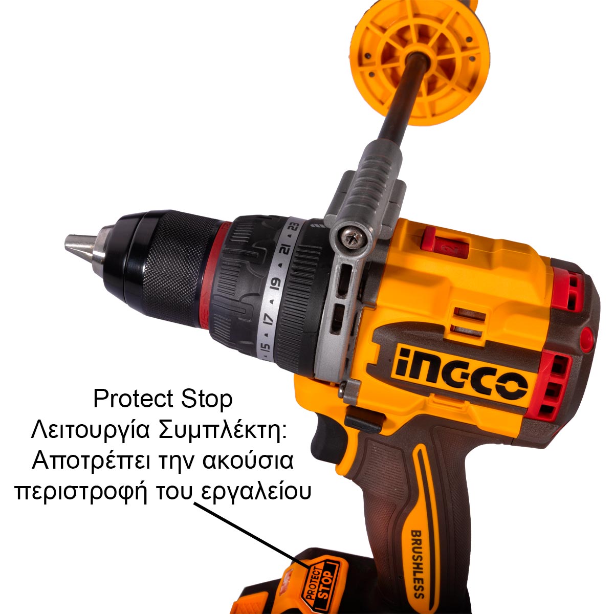 Τάση 20V, Ταχύτητα 0-550 / 0-2100rpm, Κρούσεις 0-31500bpm, Ροπή 166Nm, Ρυθμίσεις 23+1+1, Jacobs μεταλλικό τσοκ έως 13mm, Brushless μοτέρ, Protect Stop συμπλέκτης, LED φωτισμός, LED ένδειξη μπαταρίας, Κλείδωμα άξονα.