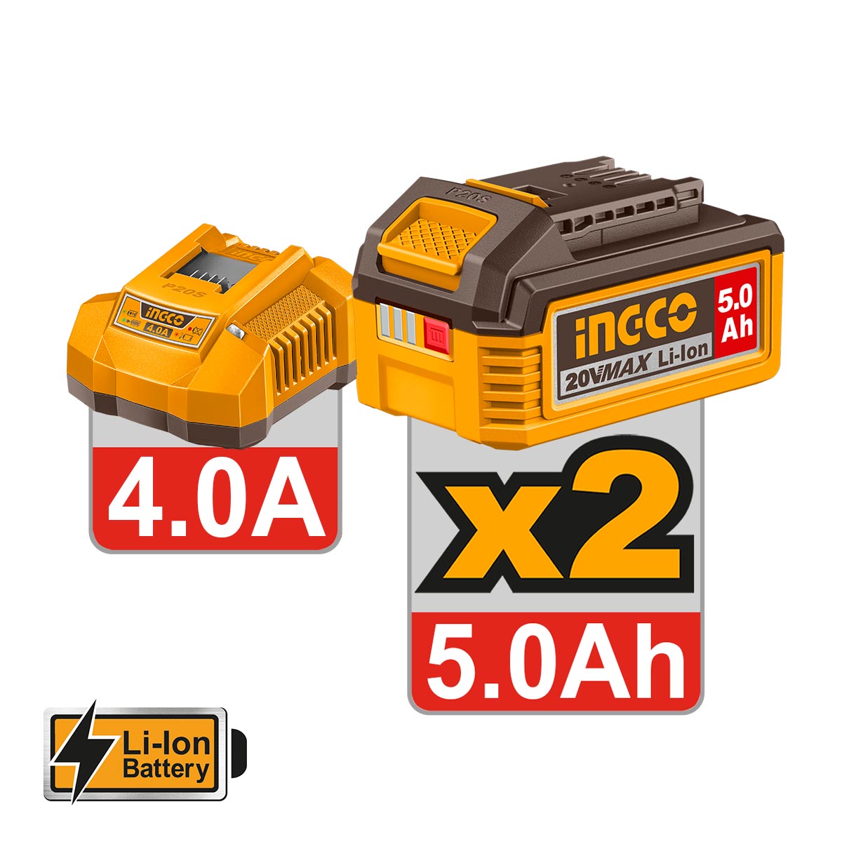 Δραπανοκατσάβιδο, 1 τεμ. φορτιστής 4A FCLI20411E, 2 τεμ. μπαταρίες 20V 5.0Ah FBLI2003, 3 τεμ. τρυπάνια ξύλου 16/19/22mm, 3 τεμ. τρυπάνια μπετού 5/6/8mm, 3 τεμ. τρυπάνια μετάλλου HSS 4/5/6mm, 2 τεμ. μύτες impact 65mm PH2+PH2 & PH2+SL6, πλαϊνή χειρολαβή, πλαστική βαλίτσα.