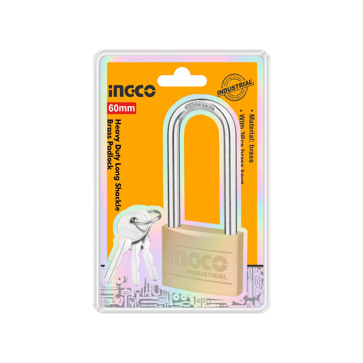 Το λουκέτο μακρύλαιμο ορειχάλκινο 60mm της INGCO είναι κατασκευασμένο από συμπαγή ορείχαλκο για αυξημένη αντοχή και αξιοπιστία. Διαθέτει μακρύ, σκληρυμένο ατσάλινο λαιμό που διευκολύνει τη χρήση σε σημεία με μεγάλο άνοιγμα, προσφέροντας υψηλή αντοχή σε κοπή και παραβίαση. Ιδανικό για επαγγελματική και οικιακή χρήση σε πόρτες, αποθήκες, κάγκελα και ρολά. Συνοδεύεται από κλειδιά ασφαλείας και αντέχει στις καιρικές συνθήκες.