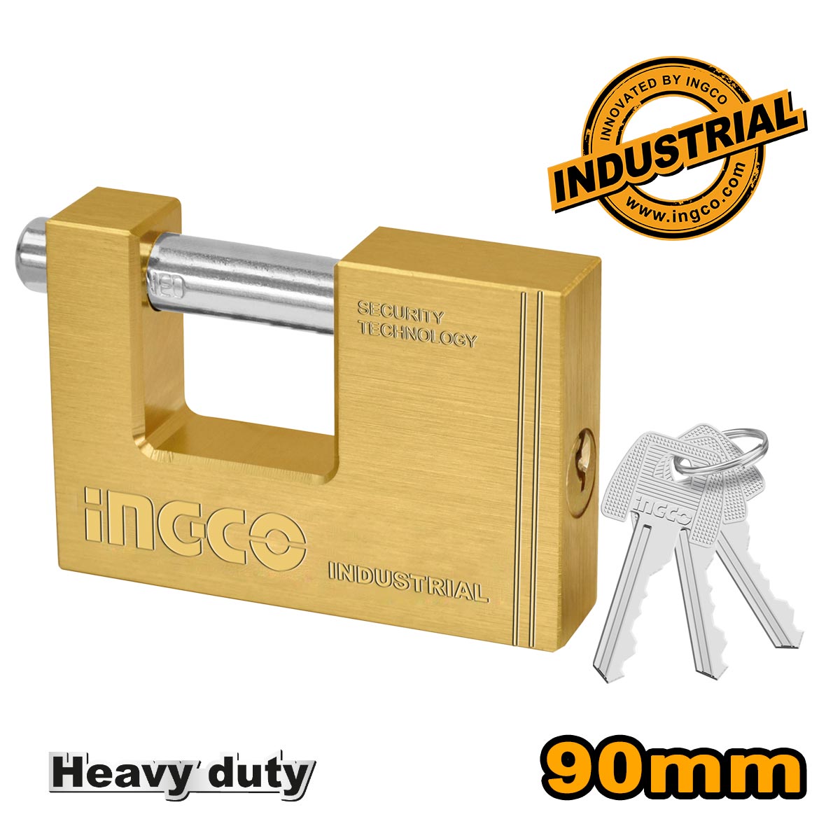 Λουκέτο τάκος ορειχάλκινο 90mm βαρέος τύπου, με ατσάλινο πείρο και 3 κλειδιά. Ιδανικό για υψηλή ασφάλεια σε πόρτες και ρολά.