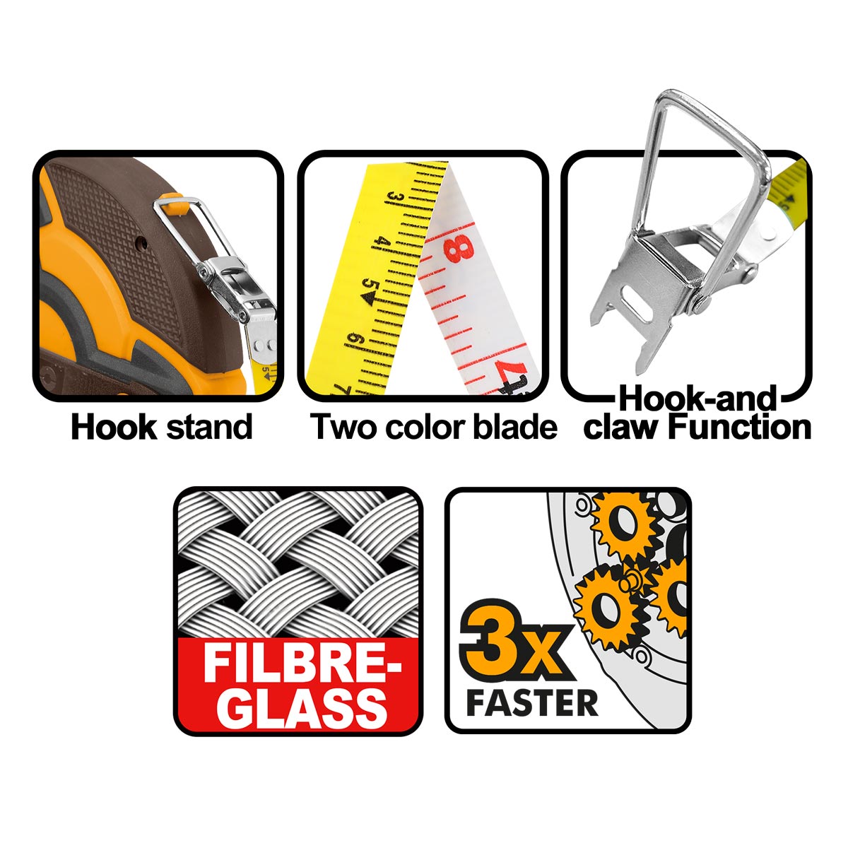 Το σύστημα γραναζιών 3:1 επιτρέπει γρήγορη επαναφορά της ταινίας, ενώ η ενσωματωμένη λαβή διευκολύνει τη χρήση. Υποστηρίζει μετρικό και αγγλικό σύστημα μέτρησης, καλύπτοντας κάθε ανάγκη.