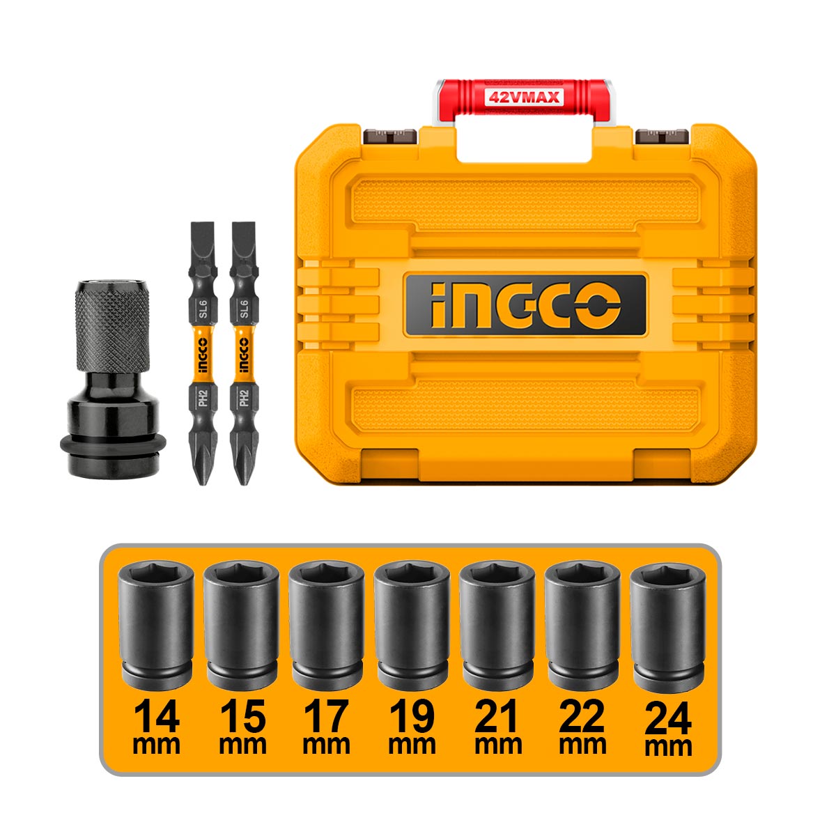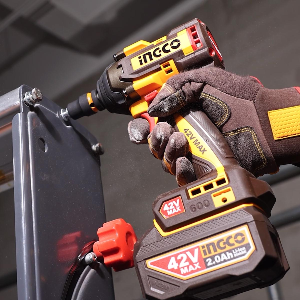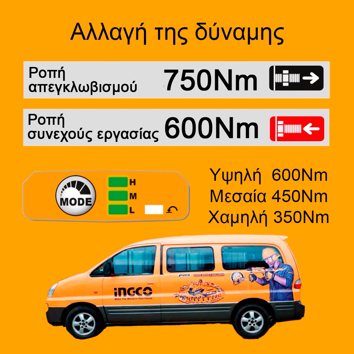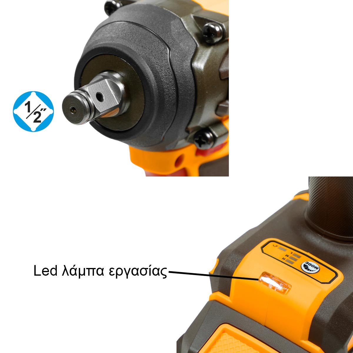 Τάση 42V, ισχύς 600W, brushless μοτέρ, ταχύτητα χωρίς φορτίο 0-1700 / 0-2100 / 0-2300 rpm, κρούσεις 0-2400 / 0-2800 / 0-3300 bpm, ροπή εργασίας 600Nm, ροπή απεγκλωβισμού 750Nm, υποδοχή 1/2″, LED λάμπα εργασίας, LED ένδειξη κατάστασης μπαταρίας