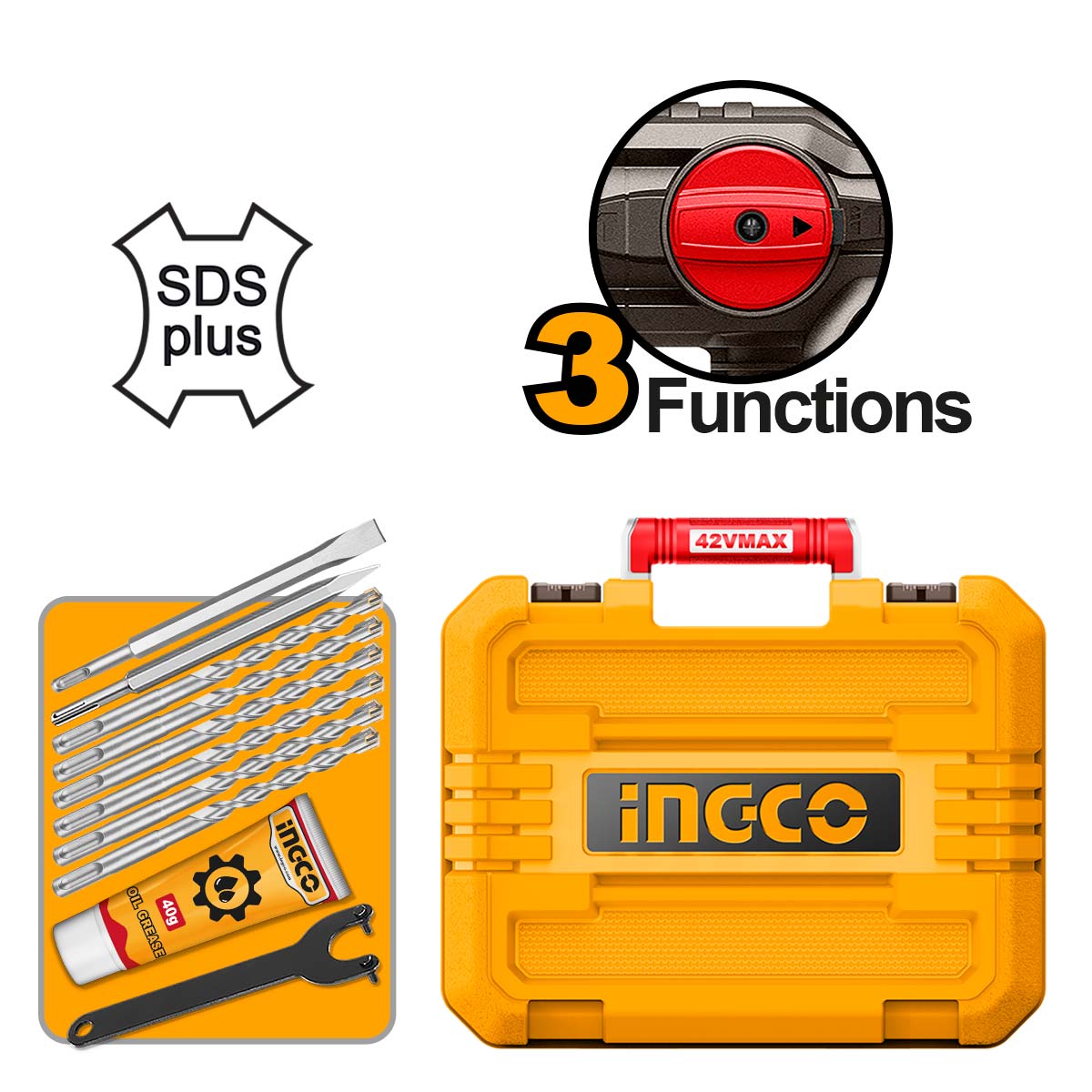Τάση 42V, ισχύς 1050W, brushless μοτέρ, κρουστική ισχύς 4.5J, ταχύτητα χωρίς φορτίο 0–900 rpm, κρούσεις 0–4400 bpm, υποδοχή SDS plus, μέγιστη διάμετρος τρυπανιού Φ28mm, αντικραδασμική πίσω λαβή, LED ένδειξη κατάστασης μπαταρίας