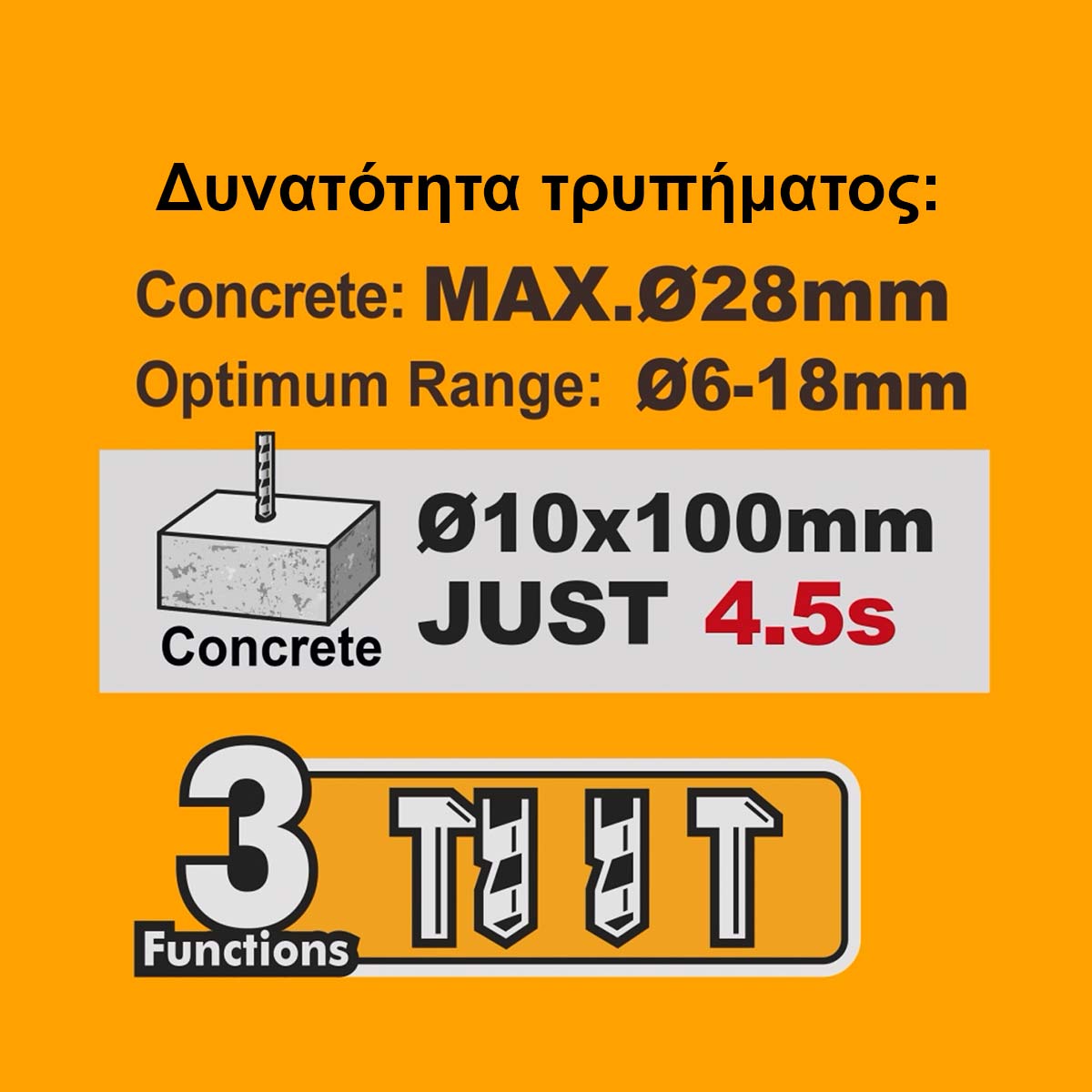 Μπετόν έως 28mm, ατσάλι έως 13mm, ξύλο έως 40mm