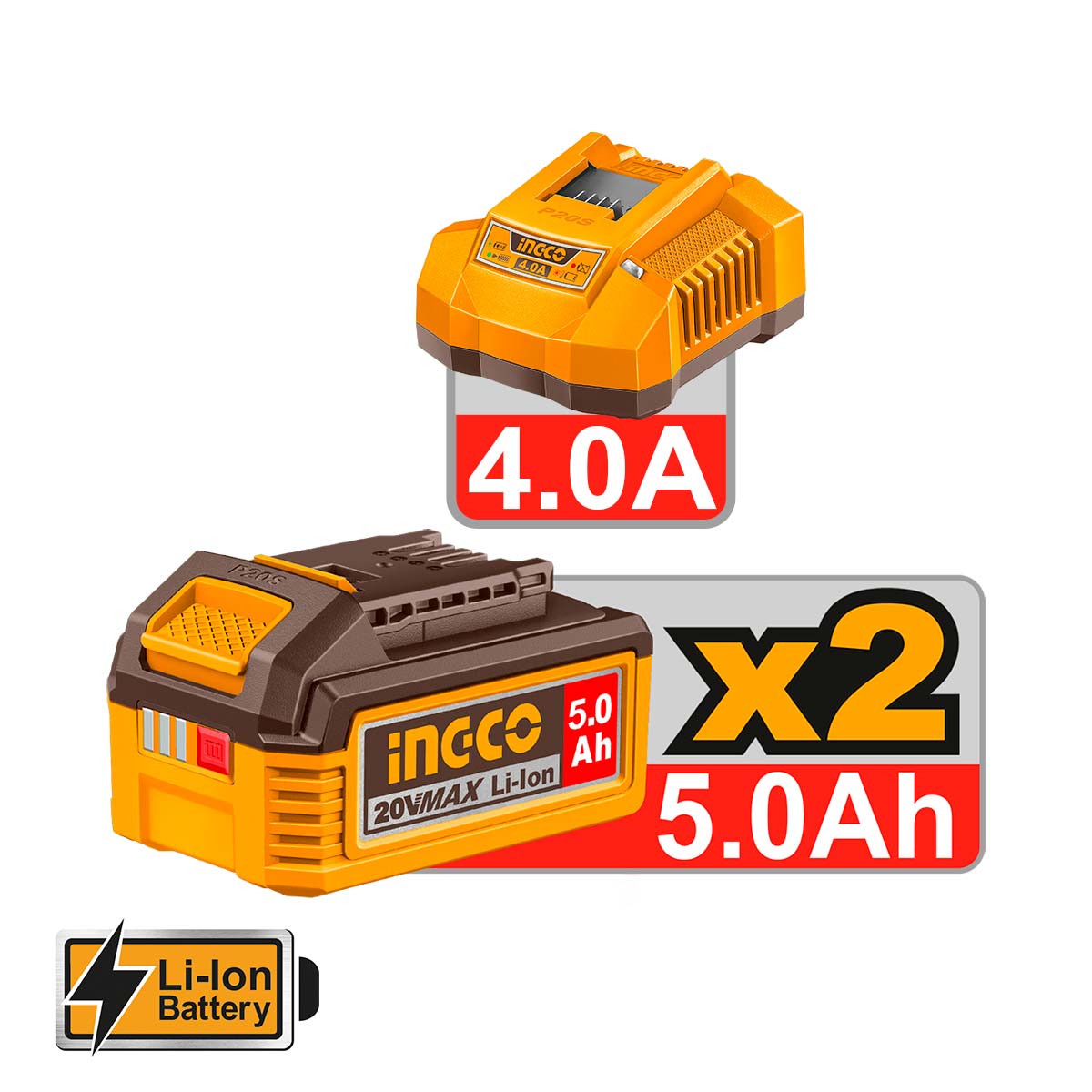 Φορτιστής 4A, 2 μπαταρίες 20V 5.0Ah Li-Ion, βελόνι, 3 τρυπάνια (8-10-12mm), κλειδί, σωληνάριο γράσσου, πλαϊνή χειρολαβή, πλαστική βαλίτσα.