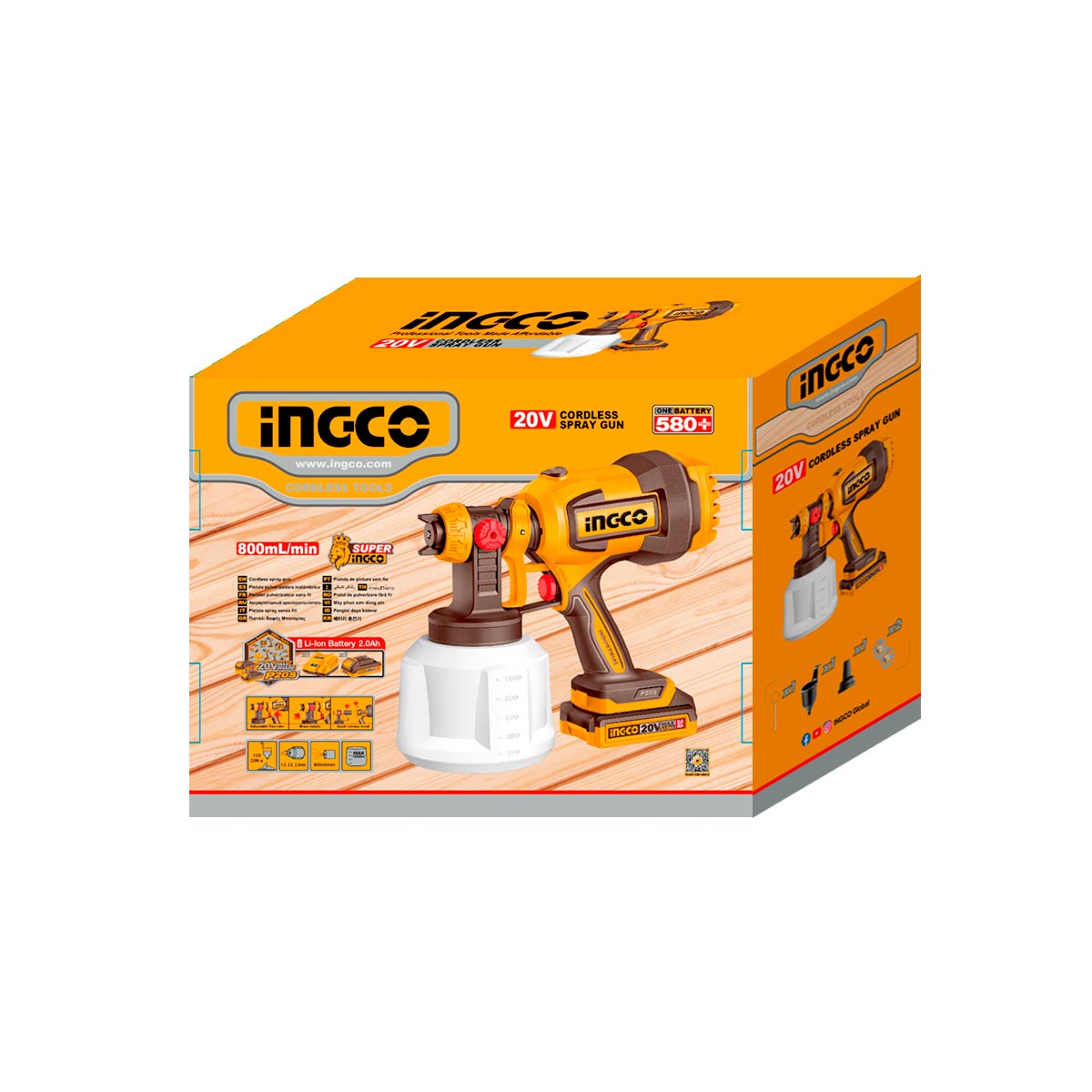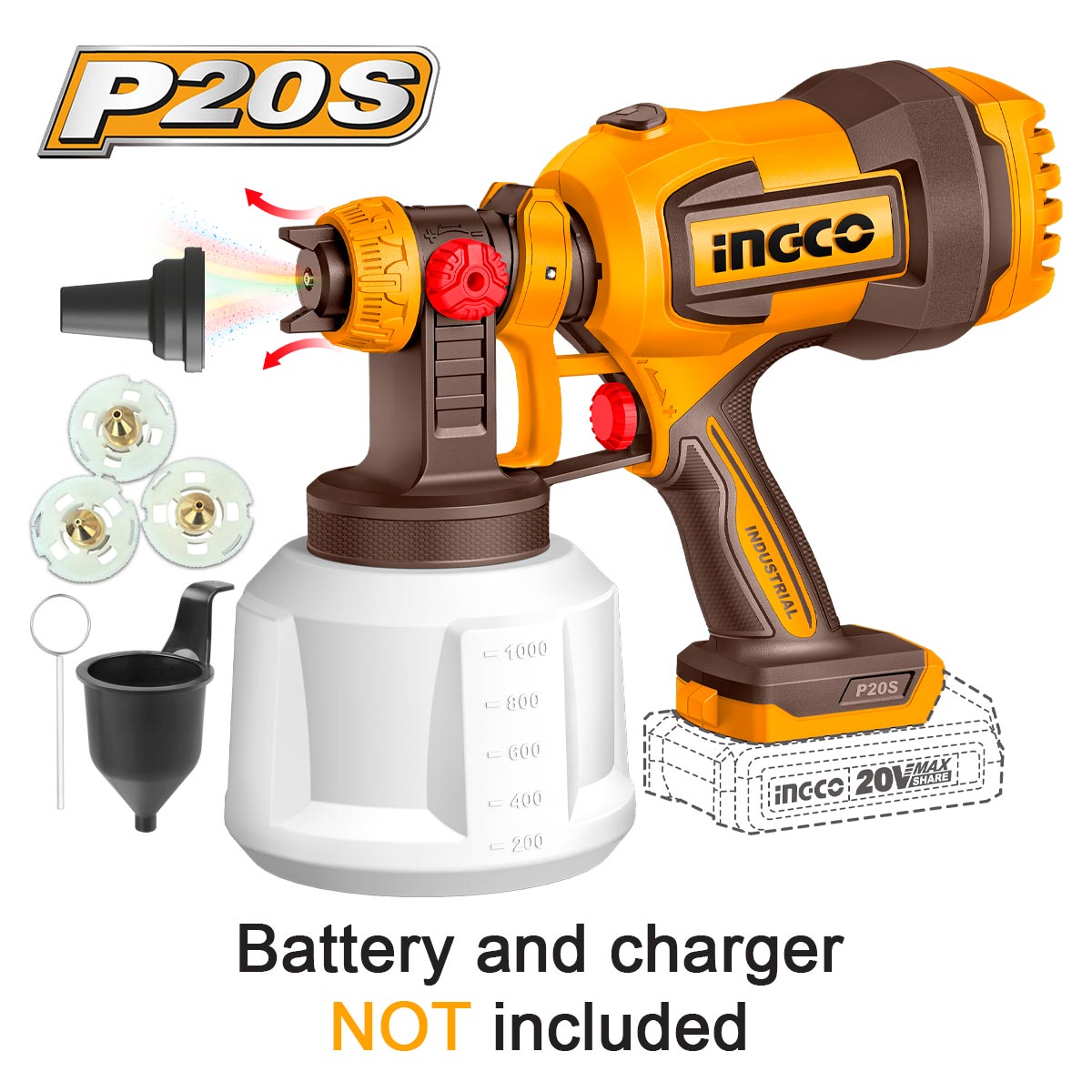 Τάση 20V, μέγιστη πίεση 0.1–0.2 bar, μέγιστη ροή χρώματος 325 ml/min, μέγιστη ροή νερού 800 ml/min, χωρητικότητα δοχείου 1000 ml, ρυθμιζόμενο πλάτος ψεκασμού, λειτουργία φυσητήρα, δυνατότητα διαχωρισμού μπεκ και κινητήρα για εύκολο καθαρισμό, έκδοση SOLO χωρίς μπαταρία και φορτιστή