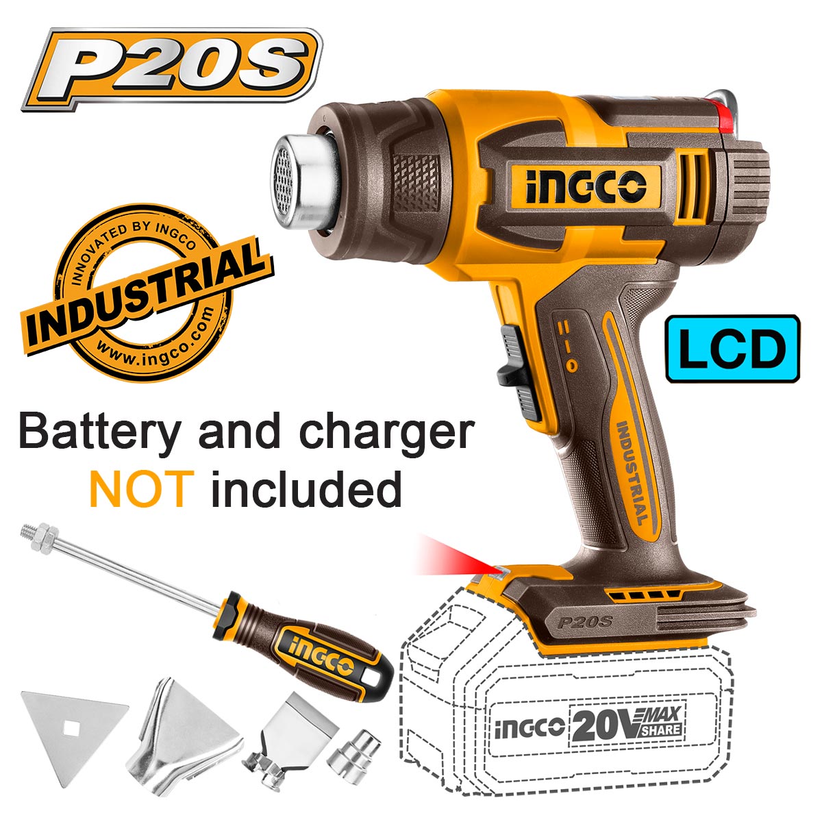 Πιστόλι θερμού αέρα μπαταρίας 20V SOLO με LCD οθόνη, ρυθμιζόμενη θερμοκρασία και διπλή ροή αέρα για ακριβή και ασφαλή εργασία.