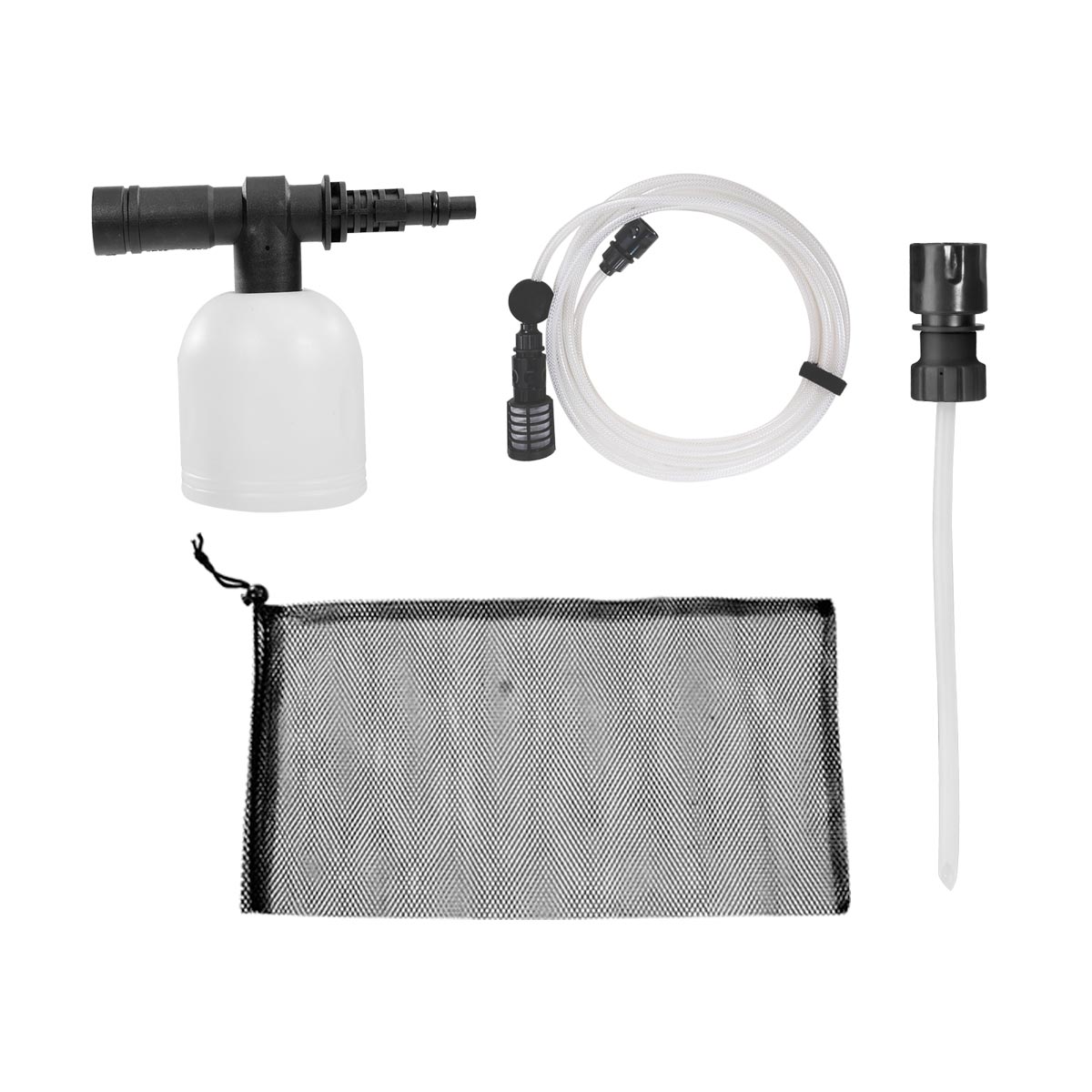 1 τεμ. εκτοξευτής–πιστόλι απορρυπαντικού 300ml, 1 τεμ. εκτοξευτής–πιστόλι νερού 2 θέσεων, 1 τεμ. λάστιχο 6m με αυτόματο κούμπωμα για αναρρόφηση από δεξαμενή, 1 τεμ. βύσμα αυτοαναρρόφησης, 1 τεμ. τσάντα μεταφοράς