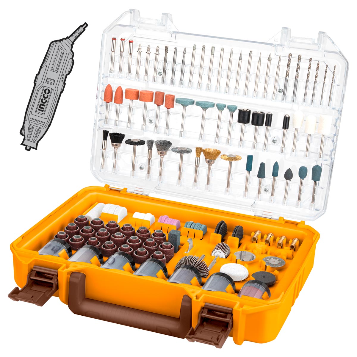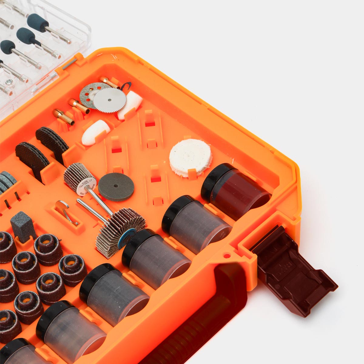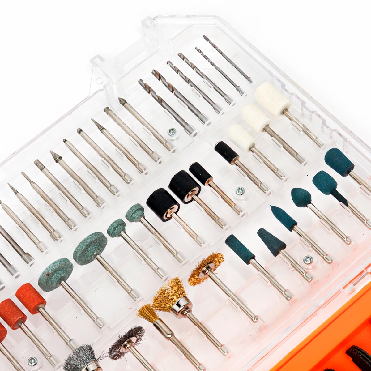 📦 Περιεχόμενα Συσκευασίας: 40 τεμ. δακτύλιοι λείανσης, 7 τεμ. δίσκοι τσόχας, 2 τεμ. μυτερή τσόχα, 1 τεμ. υφασμάτινος τροχός, 4 τεμ. τροχοί στίλβωσης από καουτσούκ, 6 τεμ. τρυπανάκια, 3 τεμ. φρέζες κοπής, 1 τεμ. διαμαντόδισκος κοπής, 1 τεμ. δίσκος κοπής, 3 τεμ. εξάρτημα για τροχό λείανσης, 10 τεμ. μεγάλες ακίδες λείανσης, 10 τεμ. κεφαλή λείανσης με διαμάντι, 9 τεμ. κεφαλές λείανσης, 9 τεμ. βούρτσες, 4 τεμ. τσοκ, 6 τεμ. δίσκοι κοπής, 1 τεμ. τροχός λείανσης, 18 τεμ. δίσκοι κοπής, 1 τεμ. πέτρα ακονίσματος, 2 τεμ. δίσκοι λείανσης φίμπερ, 1 τεμ. κλειδί, 120 τεμ. δίσκοι λείανσης, 157 τεμ. γυαλόχαρτα, 1 τεμ. πάστα, 3 τεμ. οδηγοί εξαρτημάτων, πλαστική θήκη.