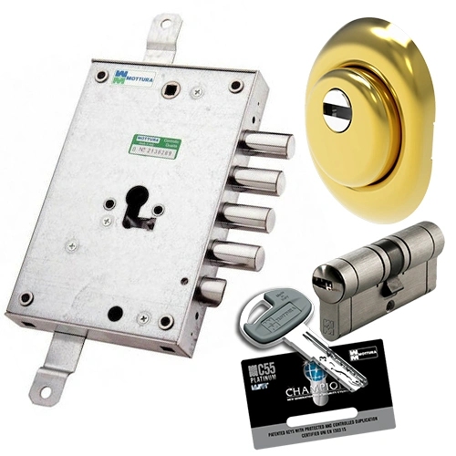 Το σετ ασφαλείας περιλαμβάνει κλειδαριά Mottura, κύλινδρο υπερασφαλείας Mottura Champions C55 και defender Securemme, προσφέροντας ολοκληρωμένη προστασία για θωρακισμένες πόρτες. Ο κύλινδρος Champions C55 διαθέτει προηγμένη τεχνολογία κατά της διάρρηξης (anti-bumping, anti-drilling, anti-picking), ενώ το defender Securemme προστατεύει αποτελεσματικά τον κύλινδρο από εξαγωγή και διάτρηση. Ιδανική λύση για αναβάθμιση ασφάλειας κατοικίας ή επαγγελματικού χώρου.
