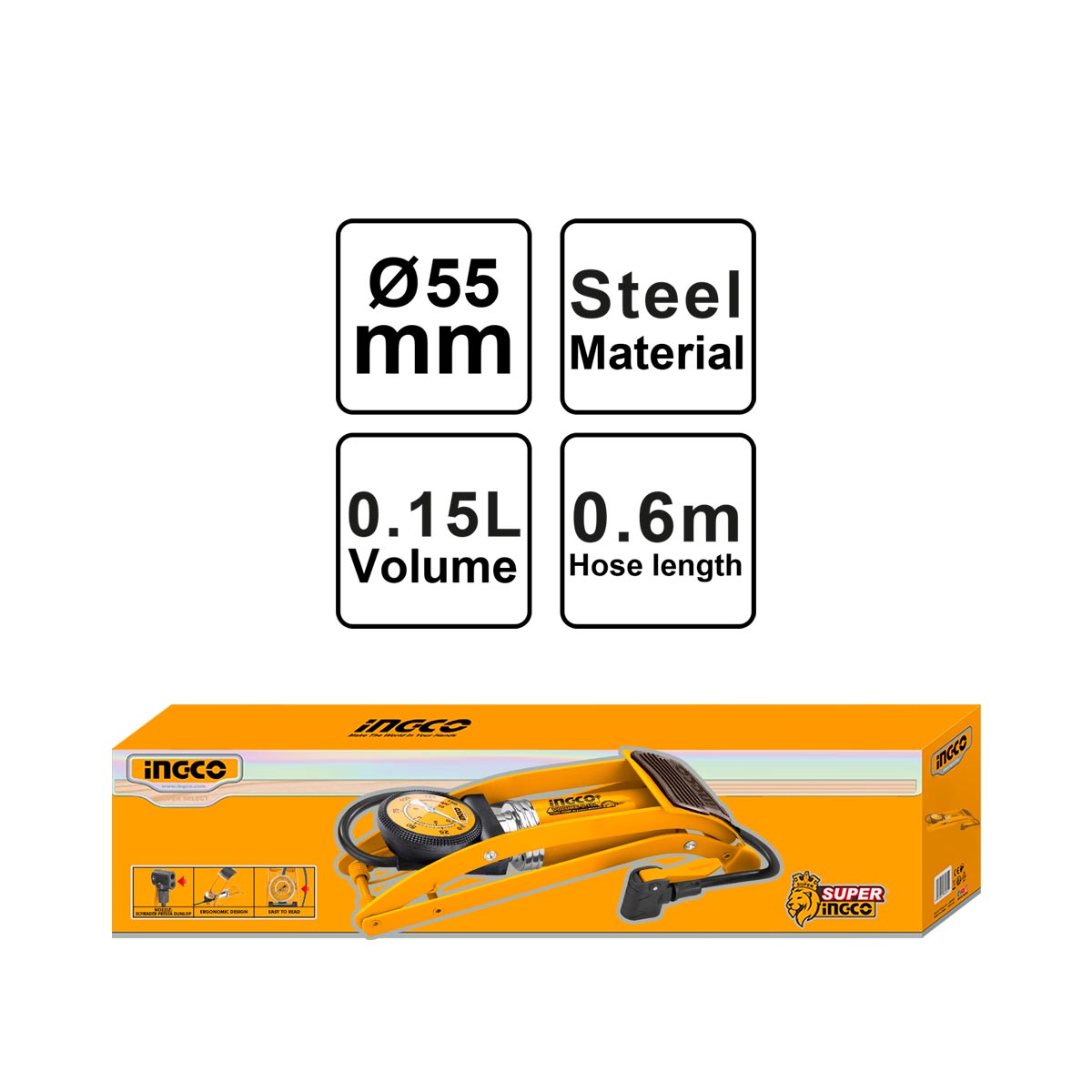 Υλικό: Αλουμίνιο & Ατσάλι, Μέγιστη πίεση: 8.3 bar / 120 PSI, Μέγεθος τρόμπας: Φ55 x 120mm, Ατσάλινος κύλινδρος και πλαίσιο, Αντιολισθητικό πεντάλ, Κατάλληλη για λάστιχα αυτοκινήτου, μηχανής & ποδηλάτου