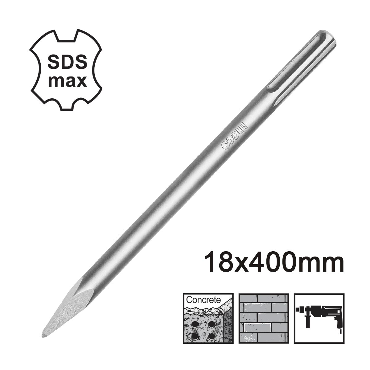 ⚙️ Χαρακτηριστικά: Μέγεθος 18x400mm, Υποδοχή SDS Max, Κατάλληλο για σκυρόδεμα και τούβλο, Συμβατό με όλα τα πιστολέτα SDS Max.